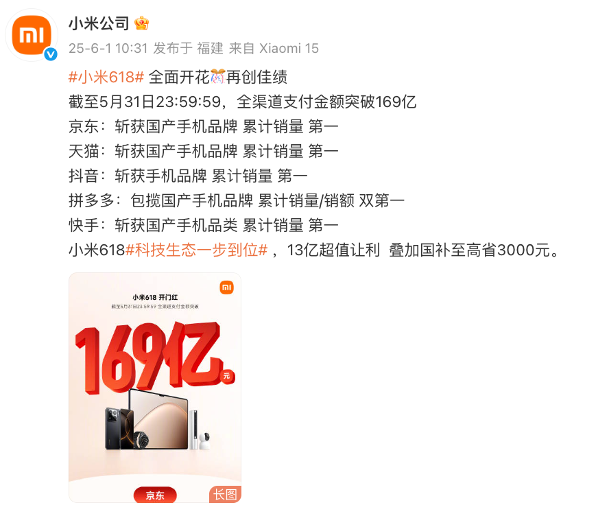官方战报显示:截至5月31日23:59:59,小米全渠道支付金额突破169亿元。其中手机方面,京东斩获国产手机品牌 累计销量 第一;天猫斩获国产手机品牌 累计销量 第一;抖音斩获手机品牌 累计销量 第一;拼多多包揽国产手机品牌 累计销量/销额 双第一;快手斩获国产手机品类 累计销量 第一等等。