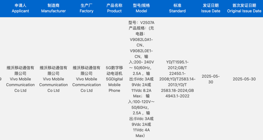 如上图所见,vivo有一款型号为V2507A的5G新机于5月30日获得3C认证,配备最高90W充电,有消息称其对应vivo即将发布的vivo X Fold5折叠屏新机。