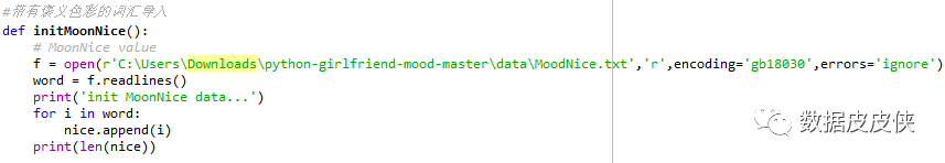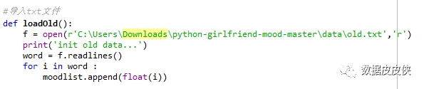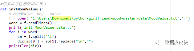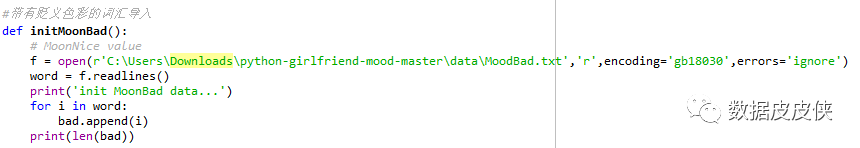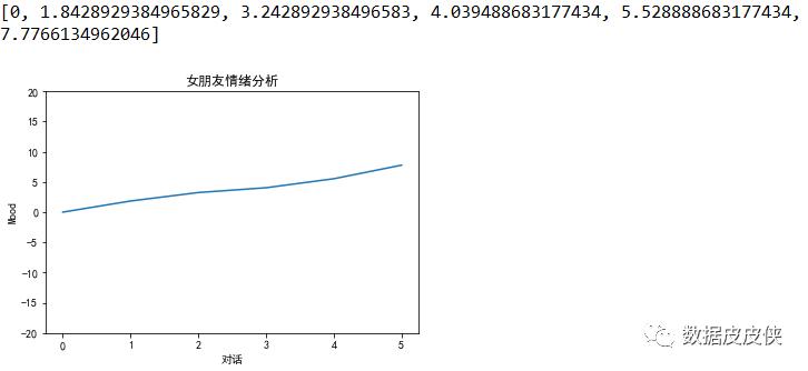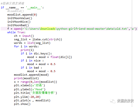 #encoding=utf-8#安装包#pip install jiebafrom __future__ import unicode_literalsimport jiebaimport matplotlib.pyplot as pltimport matplotlibplt.rcParams['font.sans-serif']=['SimHei']matplotlib.rcParams['axes.unicode_minus']=False# 基础值mood = 0# 估值字典dic = dict()# 定值序列nice = list()bad = list()#带有情感色彩的词汇导入def initMoonValue():# MoodValue key - valuef = open(r'C:\Users\Downloads\python-girlfriend-mood-master\data\MoodValue.txt','r')word = f.readlines()print('init MoonValue data...')for i in word:sp = i.split('\t')dic[sp[0]] = sp[1].replace("\n","")print(len(dic))#带有褒义色彩的词汇导入def initMoonNice():# MoonNice valuef = open(r'C:\Users\Downloads\python-girlfriend-mood-master\data\MoodNice.txt','r',encoding='gb18030',errors='ignore')word = f.readlines()print('init MoonNice data...')for i in word:nice.append(i)print(len(nice))#带有贬义色彩的词汇导入def initMoonBad():# MoonNice valuef = open(r'C:\Users\Downloads\python-girlfriend-mood-master\data\MoodBad.txt','r',encoding='gb18030',errors='ignore')word = f.readlines()print('init MoonBad data...')for i in word:bad.append(i)print(len(bad))moodlist = list()#导入txt文件def loadOld():f = open(r'C:\Users\Downloads\python-girlfriend-mood-master\data\old.txt','r')print('init old data...')word = f.readlines()for i in word :moodlist.append(float(i))#检测女朋友情绪if __name__ == '__main__':#loadOld()moodlist.append(0)initMoonValue()initMoonNice()initMoonBad()f = open(r'C:\Users\Downloads\python-girlfriend-mood-master\data\old.txt','w')while True:ch = input()seg_list = jieba.cut(str(ch))words = list(seg_list)for i in words:print(i)if i in dic.keys():mood = mood + float(dic[i])if i in nice :mood = mood + 0.5if i in bad :mood = mood - 0.5moodlist.append(mood)print(moodlist)x = range(0,len(moodlist))plt.xlabel(u'对话')plt.ylabel(u'Mood')plt.title('女朋友情绪分析')plt.ylim(-20,20)plt.plot(x , moodlist)plt.show()