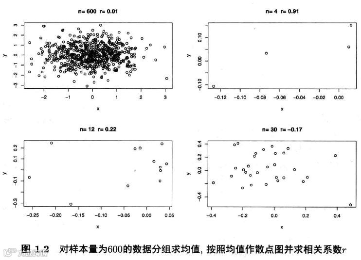 很多人喜欢用汇总数据,比如用各地区变量的均值来做诸如回归那样 的推断。这时会出现很多问题。下面把一个有600个观测值的原始数据分 成4组、12组及30组,然后求出每组的均值,看各组的相关系数的差别,并点出均值的散点图(图1.2)。图1.2显示,原来基本独立的(相关系数为0.01)两 组数据在分组并取均值之后,它们的相关系数从4个均值的0.91, 12个均值 的0.22到30个均值的-0.17。事实上,当只有两组时,相关系数为1,随着组的个 数增加,各组均值的相关系数应该接近原始数据的相关系数。