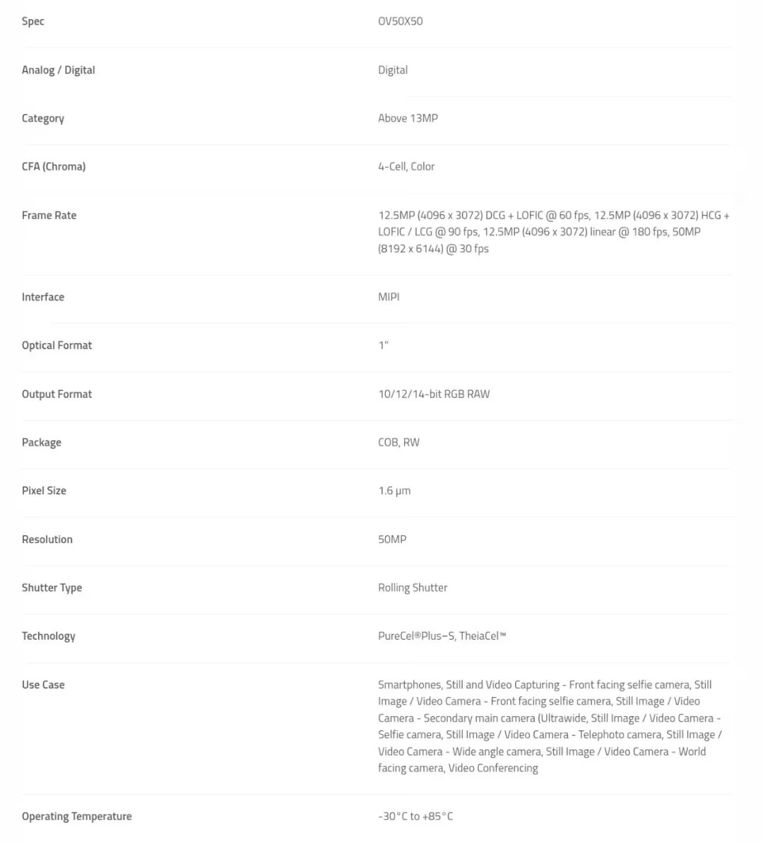据介绍OV50X采用50MP、1英寸光学格式,像素尺寸为1.6微米,专为旗舰智能手机设计,支持四合一像素合并,最大像素达1250万,支持180帧/秒和60帧/秒的高帧率,并采用三通道HDR。能够拍摄高质量的8K视频,具备双模拟增益(DAG)HDR 和传感器内裁切变焦功能。具备在单次曝光下拍摄高动态范围(HDR)视频、优异的弱光性能、快速自动对焦及高帧率的功能,支持10/12/14-bit RGB RAW、PureCel Plus-S 堆叠,支持 100% 覆盖率的四相位检测QPD。