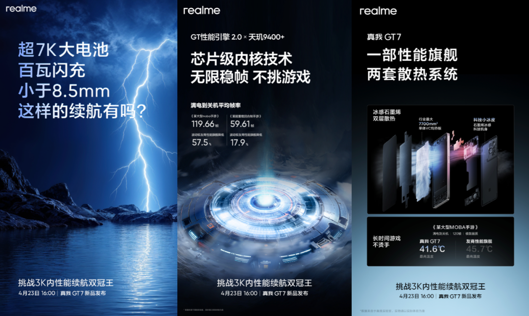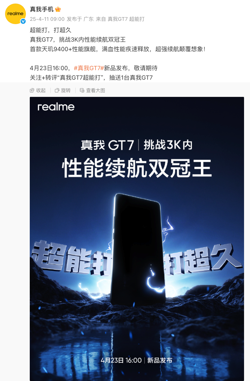 另外就是真我这边的消息了。今日联发科新款旗舰SoC——天玑9400+正式发布,目前OPPO Find X8s系列已经首发,本月还有vivo X200s、真我GT7将首批搭载,今天真我GT7正式定档。