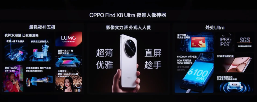 Find X8 Ultra主要配置:6.82英寸3168*1440分辨率的2K 1-120Hz LTPO居中单挖孔直屏、全局峰值亮度1600nit,超声波屏下指纹,提供月光白、星夜黑、