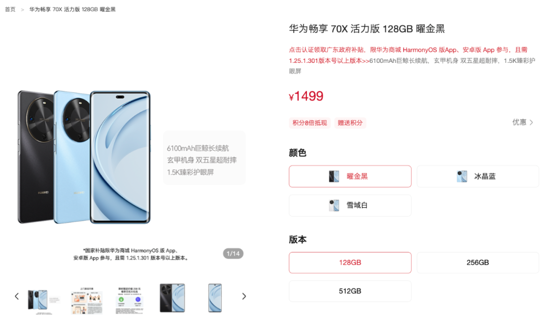 价格上,华为畅享70X活力版8+128GB版售价1499元,8+256GB版售价1699元,8+512GB版1999元,支持国补,国补后预计1274.15元起。大家觉得这机子怎么样?