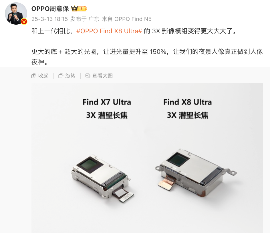 另外就是OPPO这边了。最近高管一直在预热Find X8 Ultra,今天Find系列产品负责人周意保直接公布了Find X8 Ultra的后置模组镜头组件。