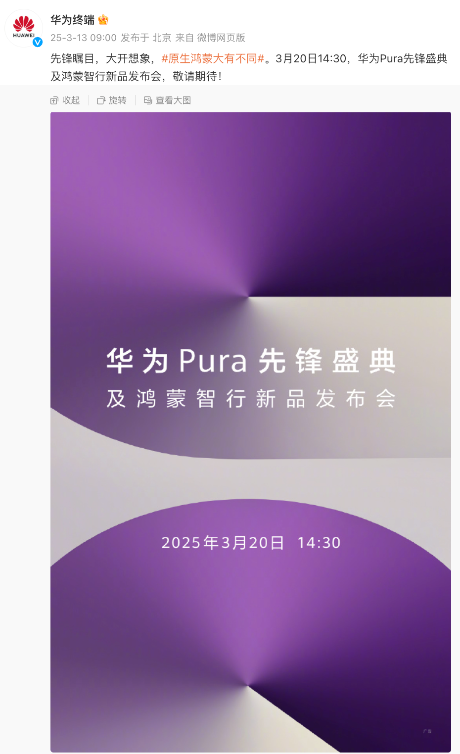 官方今日宣布华为Pura先锋盛典及鸿蒙智行新品发布会将于3月20日14:30举行,从预热来看,