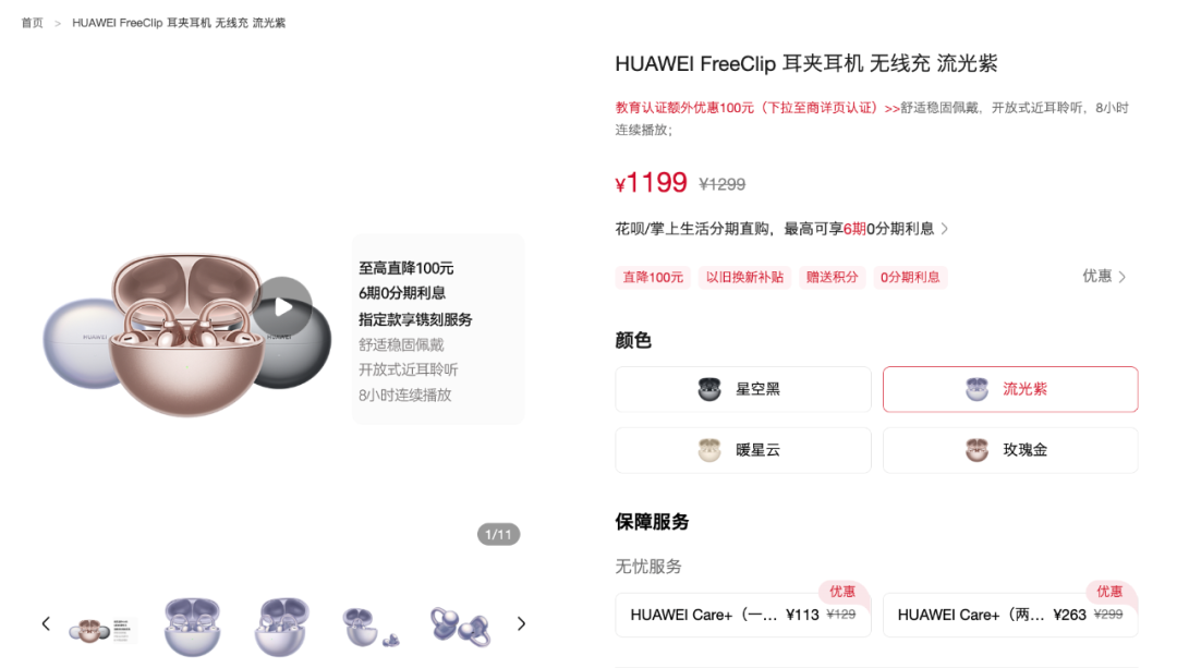 《中国无线耳机市场月度跟踪报告》中提到2024上半年开放式耳机市场同比增长303.6%,其中「无线式耳挂类」产品出货量同比增长1015%,「耳夹产品」同比增长522%,可见这两类设备的市场发展有多迅猛。而说到耳夹式耳机,华为FreeClip算是一个代表产品,价格也一直居高不下。最近有消息称小米和OPPO也将带来耳夹式耳机。