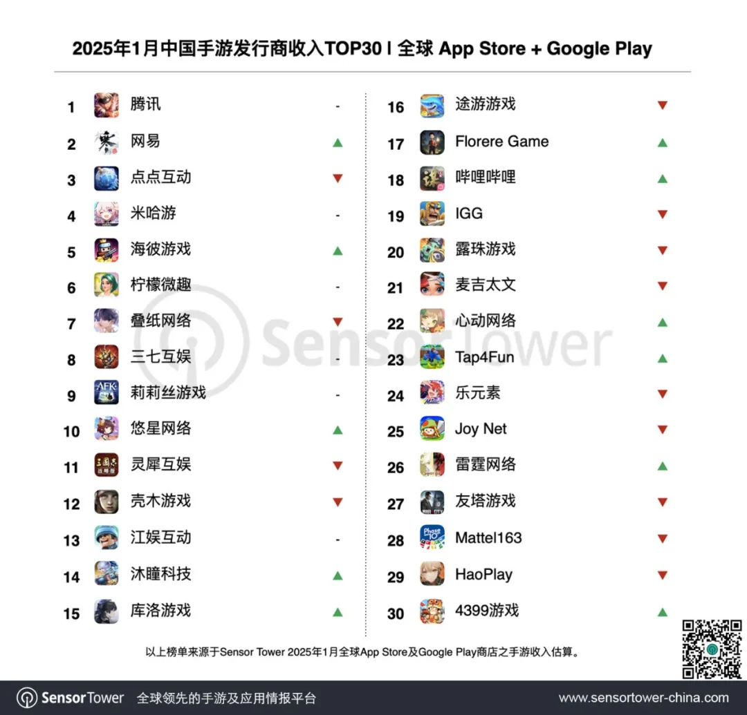 Sensor Tower数据显示:2025年1月共34个中国厂商入围全球手游发行商收入榜TOP100,合计吸金23.3亿美元(当前折合人民币约169.8亿元),占本期全球TOP100手游发行商收入39.2%,具体中国手游发行商吸金TOP3依次是腾讯、网易、点点互动,米哈游排名第4。