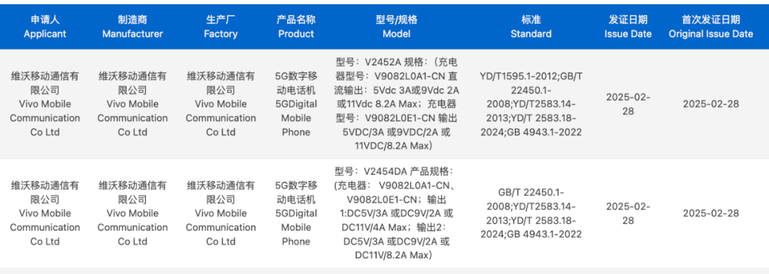 如上图所见,vivo型号为V2452A和V2454DA的两款新机昨日获得3C认证,均配备90W有线充电,消息称这两款新机对应Z10 Turbo系列,预计分别是Z10 Turbo和Z10 Turbo Pro,将分别搭载天玑8400处理器和骁龙8s Elite处理器。