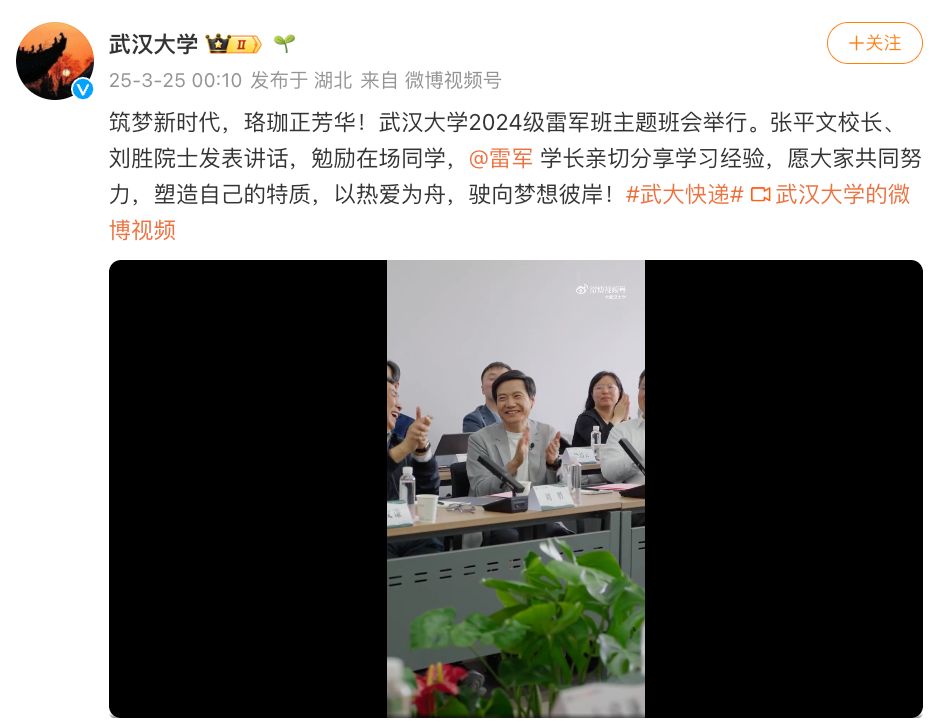武汉大学2024级雷军班主题班会,雷军在现场分享学习经验。随后雷军出席活动为