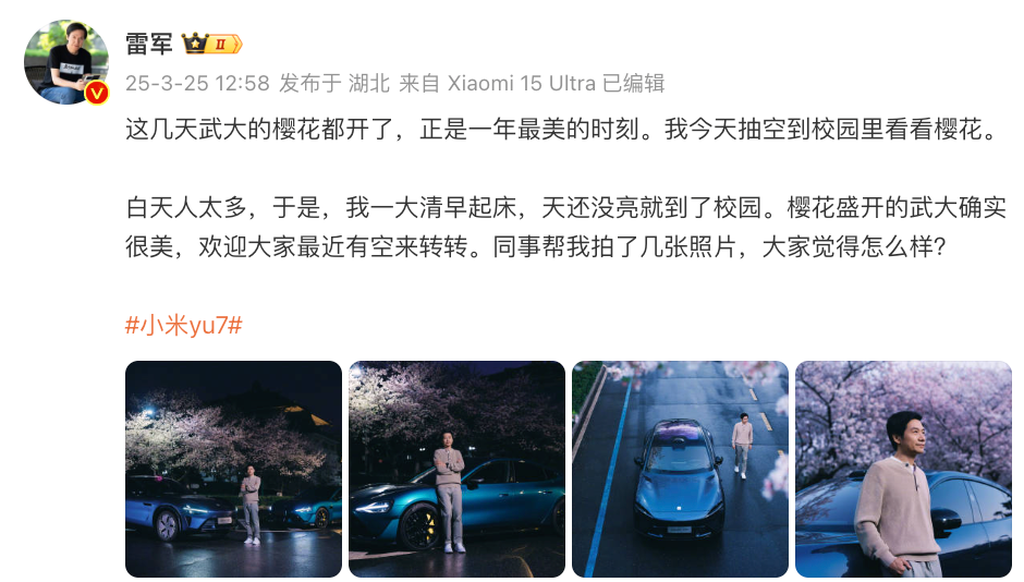 导读:雷军现身武汉行程满满 清晨五点半在母校拍YU7樱花照