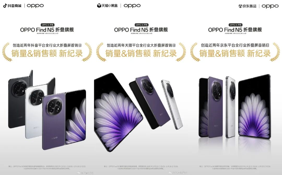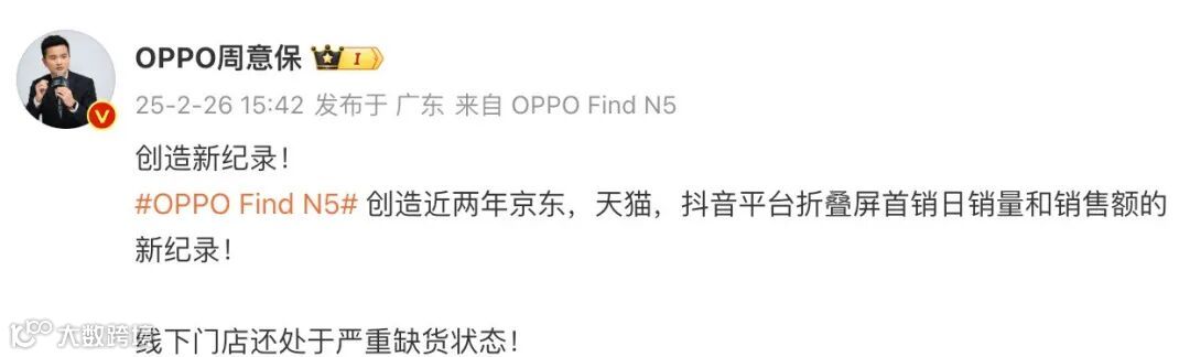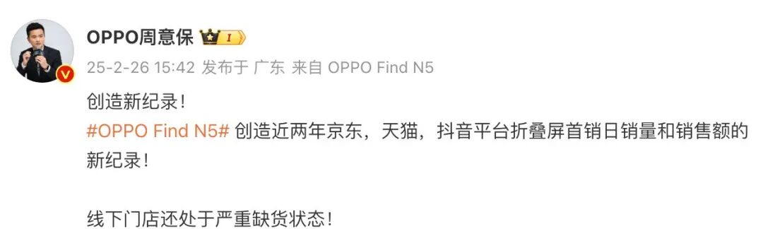 如上图所见,OPPO Find系列产品负责人周意保表示:“OPPO Find N5创造近两年京东,天猫,抖音平台折叠屏首销日销量和销售额的新纪录!线下门店还处于严重缺货状态! ”此前周意保还在Find N5发布当天晚上透露“线上全款预定是上一代同期的4.8倍,而且1TB顶配版本的占比远超预期。” 不知道有没有入手的小伙伴?