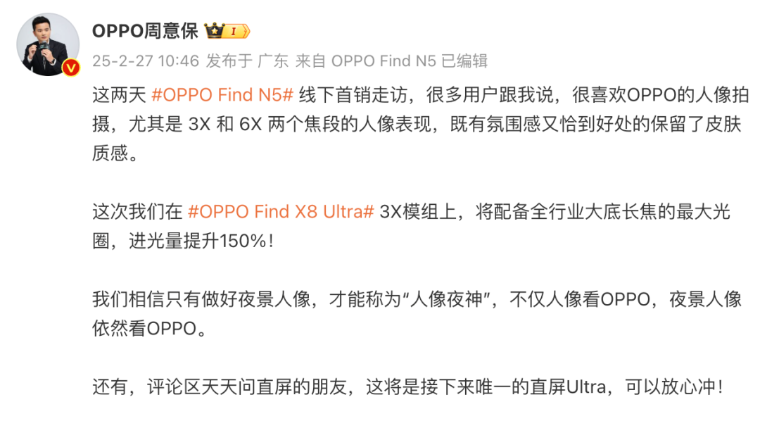 作为补充,OPPO Find系列产品负责人还表示这两天OPPO Find N5线下首销走访,很多用户反馈,很喜欢OPPO的人像拍摄,预热这次在OPPO Find X8 Ultra 3X模组上,将配备全行业大底长焦的最大光圈,进光量提升150%,「只有做好夜景人像,才能称为“人像夜神”,不仅人像看OPPO,夜景人像依然看OPPO。」大家看好OPPO这次的表现吗?