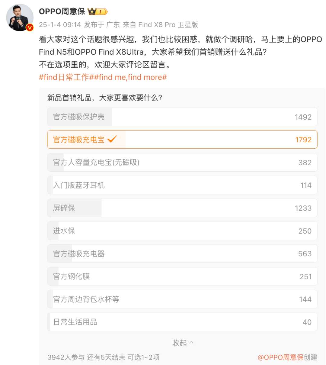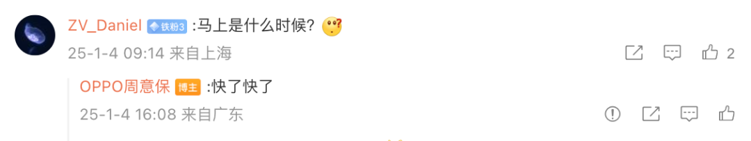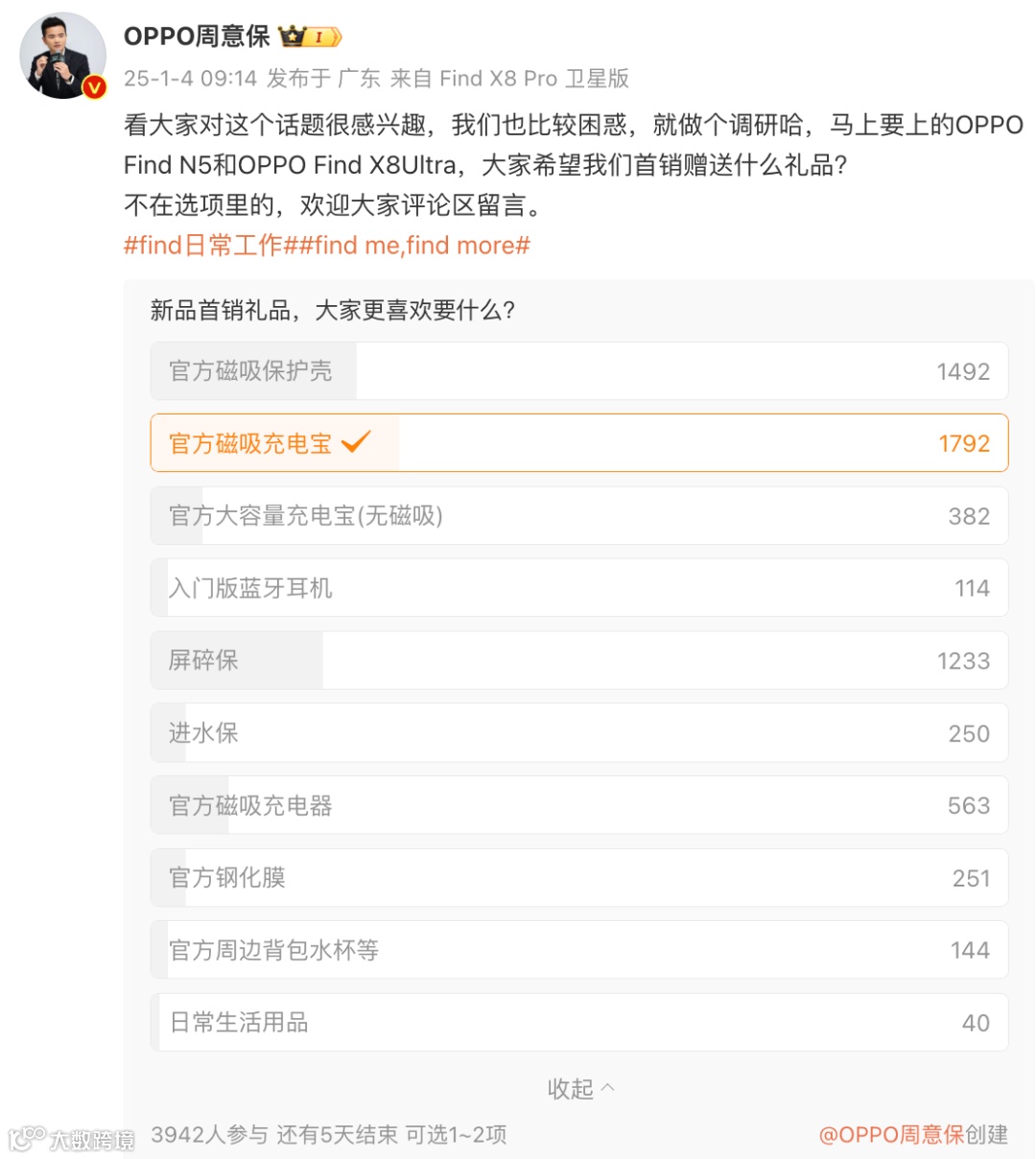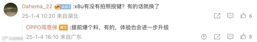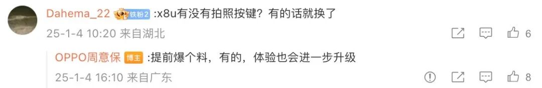 如上图所见,近日OPPO Find系列产品负责人周意保在微博调研接下来待发布的Find N5和Find X8 Ultra首销赠品,评论区回复网友时透露Find X8 Ultra也会配备拍照按键,并称体验也会进一步升级,“快了”。