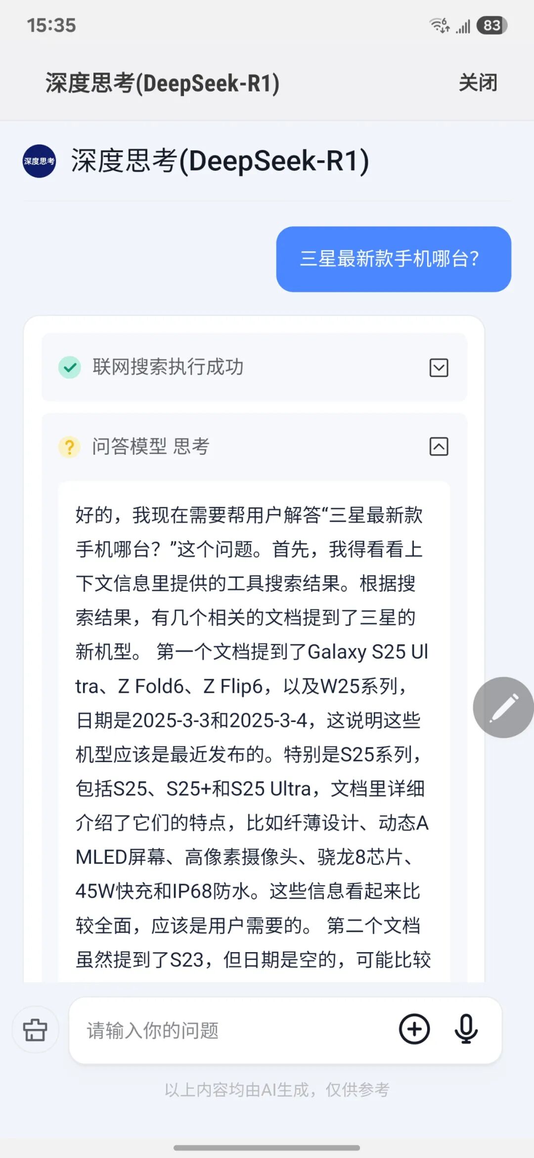 如上图所见,本人实测查看手中的国行三星S25 Ultra,现在已经可以使用DeepSeek,除了可以深度思考外,还默认开启联网搜索。