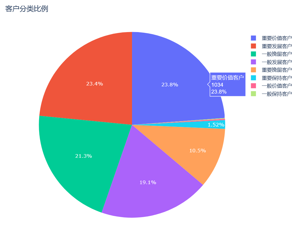 根据可视化数据可知,该公司最多的是重要价值客户和重要发展客户,占比达到47.2%,这两类客户是该公司创造收益价值的主力军。企业应对此类客户多关心或多收集意见建议。