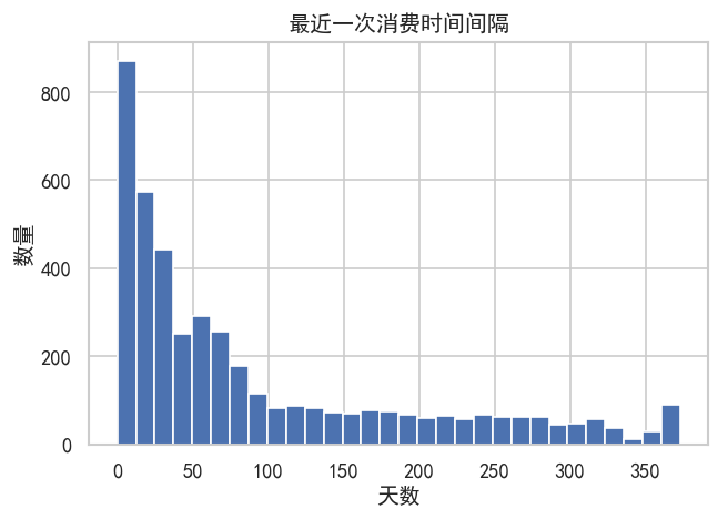 plt.title("最近一次消费时间间隔", fontsize=12)