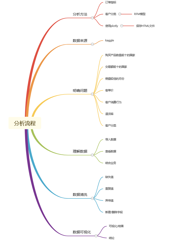 本次分析以英国礼品电商公司——Kaggle2010年12月1日至2011年12月9日在英国注册的非实体网上零售发生的所有交易数据为对象,Python作为分析工具,结合实际业务指标,分析其销售、退货等情况,且依据RFM模型对客户进行分类。最终得出数据及静态或动态的可视化结果,并对结果进行解读,同时针对不同业务和不同层级的客户提出相关对策和建议。