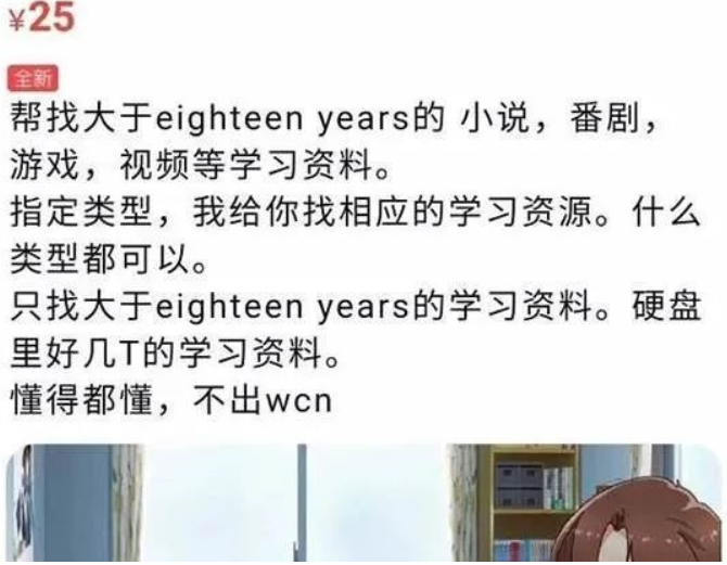 更可怕的是,在闲鱼上,有用户将色情信息资源包装成 “学习资料”进行售卖。新浪科技通过搜索 “二次元”的关键词便轻易找到一位闲鱼卖家,他可以 “帮找小说、番剧、游戏、视频等学习资料。什么类型都可以,硬盘里好几 T 的学习资料。”卖家表示提供代找涉黄资源的服务,25 元一次。
