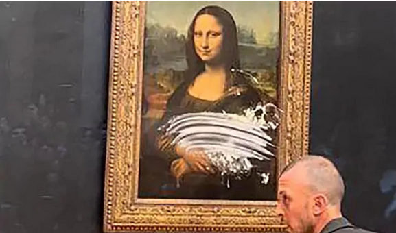 法国巴黎卢浮宫的镇馆之宝之一——达·芬奇名画《蒙娜丽莎》29日被一大块蛋糕砸中。幸运的是,蛋糕砸在了《蒙娜丽莎》外层的玻璃罩上,这幅名画并未受到影响。此次事件的肇事者是一名坐在轮椅上戴着假发伪装成老妇人的男子,他先是试图砸破保护《蒙娜丽莎》的玻璃,失败之后,该男子向这幅名画扔了一大块蛋糕。视频显示,一大块白色的奶油留在这幅画的下半部分,几乎覆盖“蒙娜丽莎”的双手和手臂。安保人员迅速赶来并将该男子带走,此时这名破坏者开始冲着惊呆了的人群大喊:“想想地球吧,让艺术家们都考虑考虑地球!所有的艺术家都要为地球考虑,这就是我这样做的原因!”