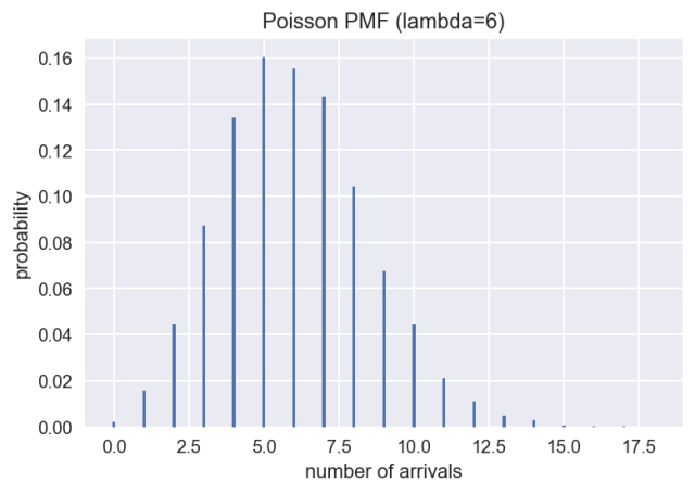 比如你在等公交车,假设这些公交车的到来是独立且随机的(当然这不是现实),前后车之间没有关系,那么在1小时中到来的公交车数量就符合泊松分布。同样使用统计模拟的方法绘制该泊松分布,这里假设每小时平均来6辆车(即上述公式中lambda=6)。