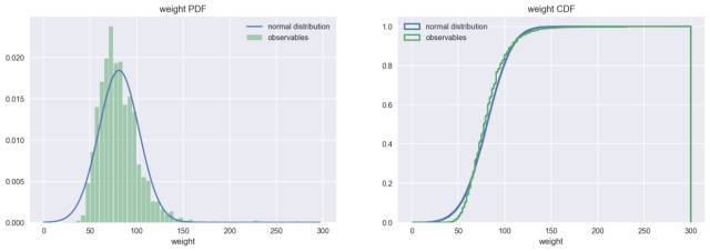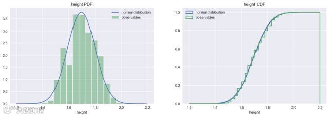 def plot_pdf_cdf(data, xbins, xrange, xlabel): '''绘制概率密度函数PDF和累积分布函数CDF''' fig = plt.figure(figsize=(16,5)) # 设置画布尺寸 p1 = fig.add_subplot(121) # 添加第一个子图 # 绘制正态分布PDF曲线 std = data.std() mean = data.mean() x = np.arange(xrange[0], xrange[1], (xrange[1]-xrange[0])/100) y = norm_pdf(x, mean, std) plt.plot(x,y, label='normal distribution') # 绘制数据的直方图 plt.hist(data, bins=xbins, range=xrange, rwidth=0.9, alpha=0.5, normed=True, label='observables') # 图片设置 plt.legend() plt.xlabel(xlabel) plt.title(xlabel +' PDF') p2 = fig.add_subplot(122) #添加第二个子图 # 绘制正态分布CDF曲线 sample = np.random.normal(mean, std, size=10000) plt.hist(sample, cumulative=True, bins=1000, range=xrange, normed=True, histtype='step', lw=2, label='normal distribution') # 绘制数据的CDF曲线 plt.hist(data, cumulative=True, bins=1000, range=xrange, normed=True, histtype='step', lw=2, label='observables') #图片设置 plt.legend(loc='upper left') plt.xlabel(xlabel) plt.title( xlabel + ' CDF') plt.show()
