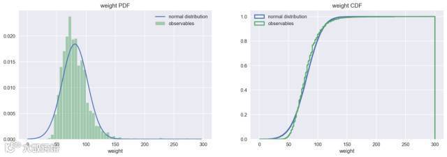 但是体重分布明显右偏,与对称的正态分布存在一定的差异。