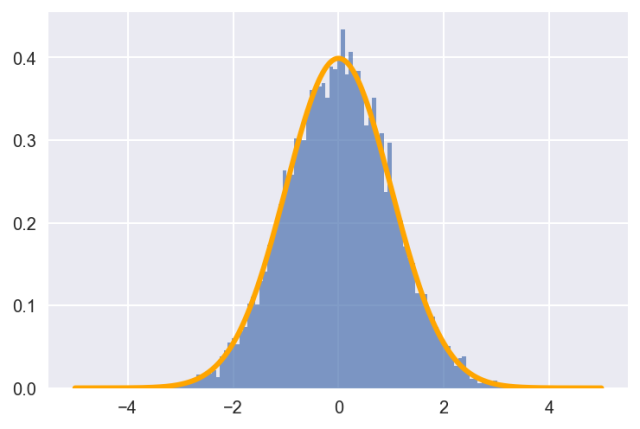 def norm_pdf(x,mu,sigma): '''正态分布概率密度函数''' pdf = np.exp(-((x - mu)**2) / (2* sigma**2)) / (sigma * np.sqrt(2*np.pi)) return pdf mu = 0 # 均值为0sigma = 1 # 标准差为1# 用统计模拟绘制正态分布的直方图sample = np.random.normal(mu, sigma, size=10000) plt. hist(sample, bins=100, alpha=0.7, normed=True)# 根据正态分布的公式绘制PDF曲线x = np.arange(-5, 5, 0.01) y = norm_pdf(x, mu, sigma) plt.plot(x,y, color='orange', lw=3) plt.show()