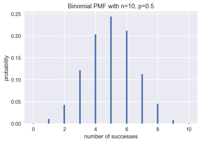 二项分布是n个独立的是/非试验中成功的次数的概率分布,其中每次试验的成功概率为p。这是一个离散分布,所以使用概率质量函数(PMF)来表示k次成功的概率: