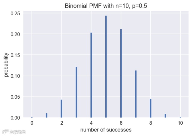 def plot_binomial(n,p): '''绘制二项分布的概率质量函数''' sample = np.random.binomial(n,p,size=10000) # 产生10000个符合二项分布的随机数 bins = np.arange(n+2) plt.hist(sample, bins=bins, align='left', normed=True, rwidth=0.1) # 绘制直方图 #设置标题和坐标 plt.title('Binomial PMF with n={}, p={}'.format(n,p)) plt.xlabel('number of successes') plt.ylabel('probability') plot_binomial(10, 0.5)