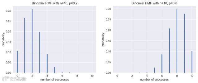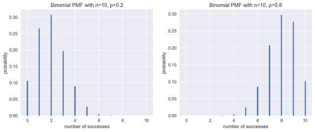 fig = plt.figure(figsize=(12,4.5)) #设置画布大小p1 = fig.add_subplot(121) # 添加第一个子图plot_binomial(10, 0.2) p2 = fig.add_subplot(122) # 添加第二个子图plot_binomial(10, 0.8)