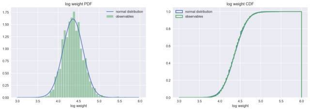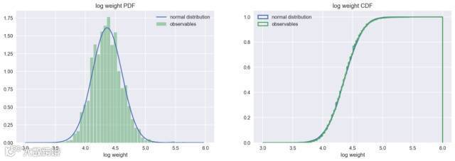 将体重数据取对数值后,其分布就与正态分布非常吻合。