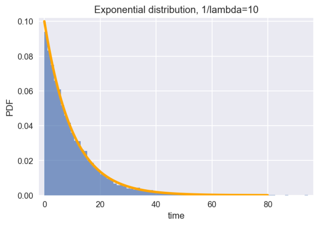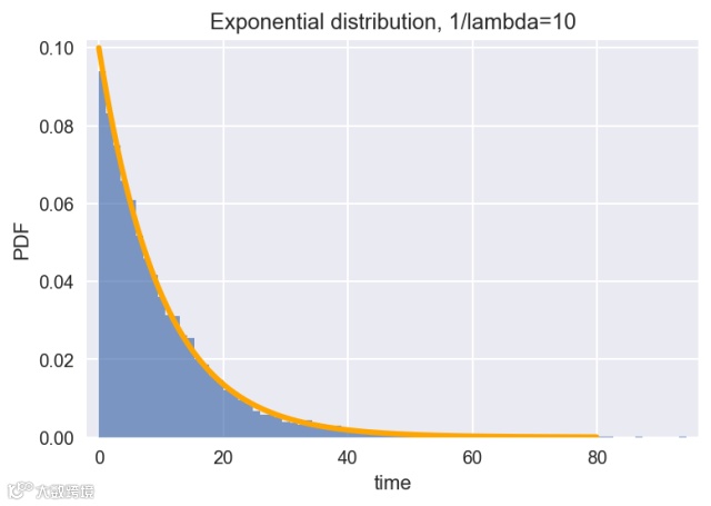 tau = 10sample = np.random.exponential(tau, size=10000) # 产生10000个满足指数分布的随机数plt.hist(sample, bins=80, alpha=0.7, normed=True) #绘制直方图plt.margins(0.02) # 根据公式绘制指数分布的概率密度函数lam = 1 / tau x = np.arange(0,80,0.1) y = lam * np.exp(- lam * x) plt.plot(x,y,color='orange', lw=3)#设置标题和坐标轴plt.title('Exponential distribution, 1/lambda=10') plt.xlabel('time') plt.ylabel('PDF') plt.show()
