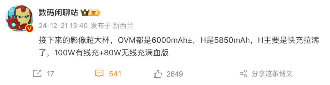 另外就是国产旗舰这边了。临近年底各家超大杯旗舰消息多了起来,目前率先官宣的是荣耀Magic7 RSR保时捷设计(12.23发),其他家应该都要等到2025年了,今天关于小米15 Ultra、OPPO Find X8 Ultra、vivo X200 Ultra电池容量有更多爆料。