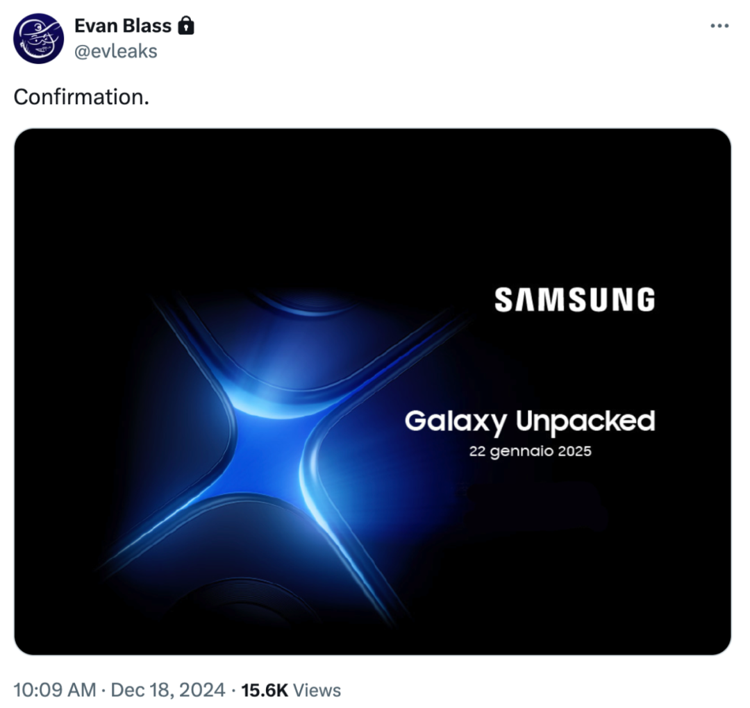 据爆料达人evleaks曝光的海报显示,三星将于1月22日在美国举行Galaxy Unpacked活动,届时也将发布全新Galaxy S25系列,不过今年可能是4款型号,除了常规的S25、S25+、S25 Ultra外,爆料还有一款全新Slim机型(更轻薄)。