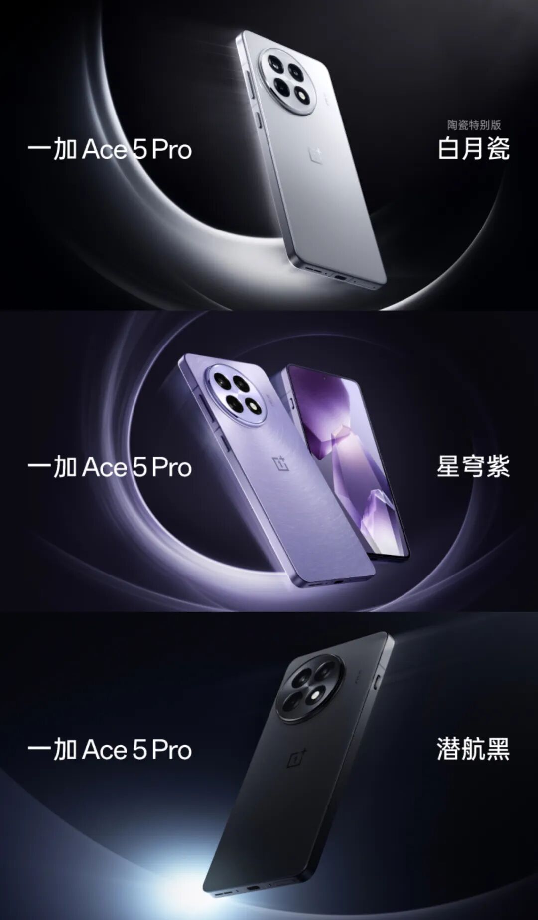 一加Ace5 Pro提供潜航黑(丝绸玻璃)、星穹紫(星轨玻璃)、白月瓷(陶瓷)3个配色。