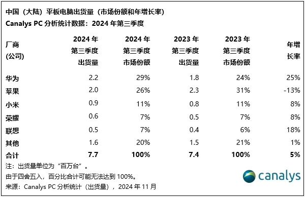 至于平板电脑这边,2024Q3出货量同比增长5%,达到770万台,市场份额TOP5依次是:①华为(29%)②苹果(26%)③小米(11%)④荣耀(7%)⑤联想(7%)。不知道这两张份额排名图和大家心中是否一致~