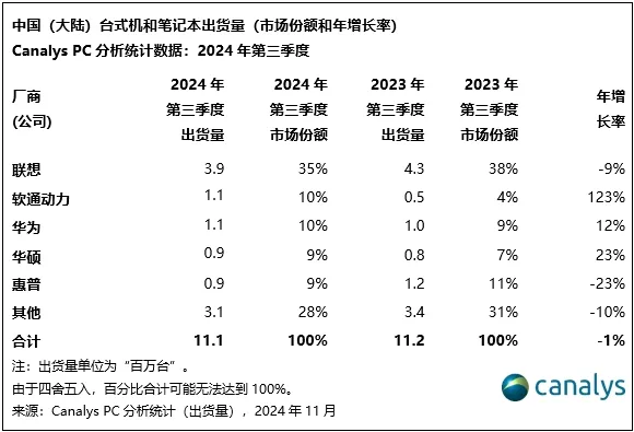 最后分享一份市场数据。近日研究机构Canalys发布了2024年第三季度(7-9月)中国大陆PC出货量报告,来看看头部厂商都是哪几家~