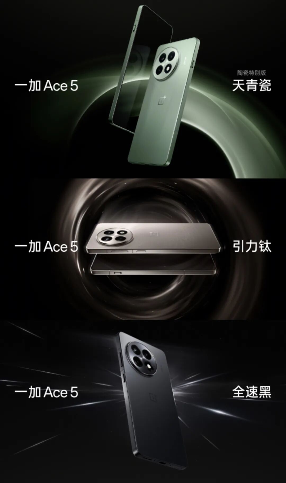 具体一加Ace5提供全速黑(丝绸玻璃)、引力钛(丝绸玻璃)、天青瓷(陶瓷)3个版本;