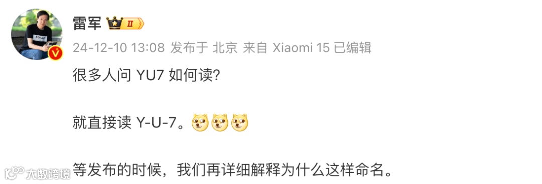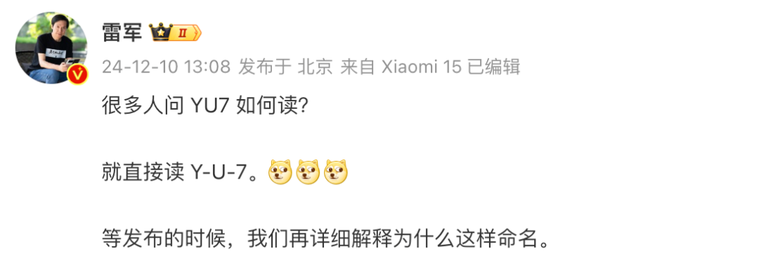 至于“小米YU7”该怎么读,雷军称「就直接读 Y-U-7。等发布的时候,我们再详细解释为什么这样命名。 」