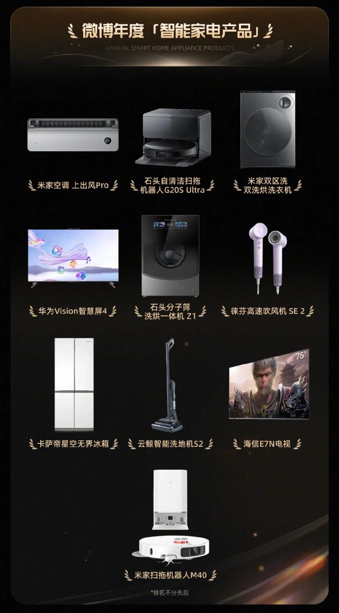🏆微博年度「智能家电产品」:米家空调 上出风Pro、石头自清洁扫拖机器人G20S Ultra、米家双区洗双洗烘洗衣机、华为Vision智慧屏4、石头分子筛洗烘一体机 Z1、徕芬高速吹风机 SE 2、卡萨帝星空无界冰箱、云鲸智能洗地机S2、海信E7N电视、米家扫拖机器人M40(排名不分先后)。不知道获奖的这些设备里有没有你正在用的~