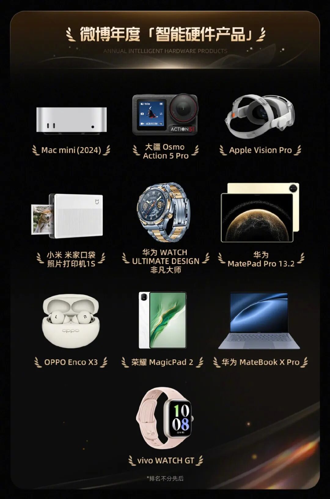 🏆微博年度「智能硬件产品」获奖的有:Mac mini 2024、大疆Osmo Action 5 Pro、Vision Pro、米家口袋照片打印机1s、华为WATCH ULTIMATE DESIGN非凡大师、华为MatePad Pro 13.2、OPPO Enco X3、荣耀MagicPad2、华为MateBook X Pro、vivo Watch GT(排名不分先后)。