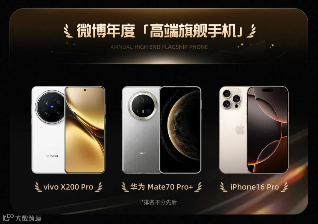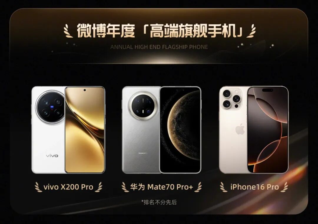 如上图所见,🏆微博年度「高端旗舰手机」:vivo X200 Pro、华为Mate 70 Pro+、iPhone 16 Pro(排名不分先后);🏆微博年度「折叠旗舰手机」:华为Mate XT非凡大师。