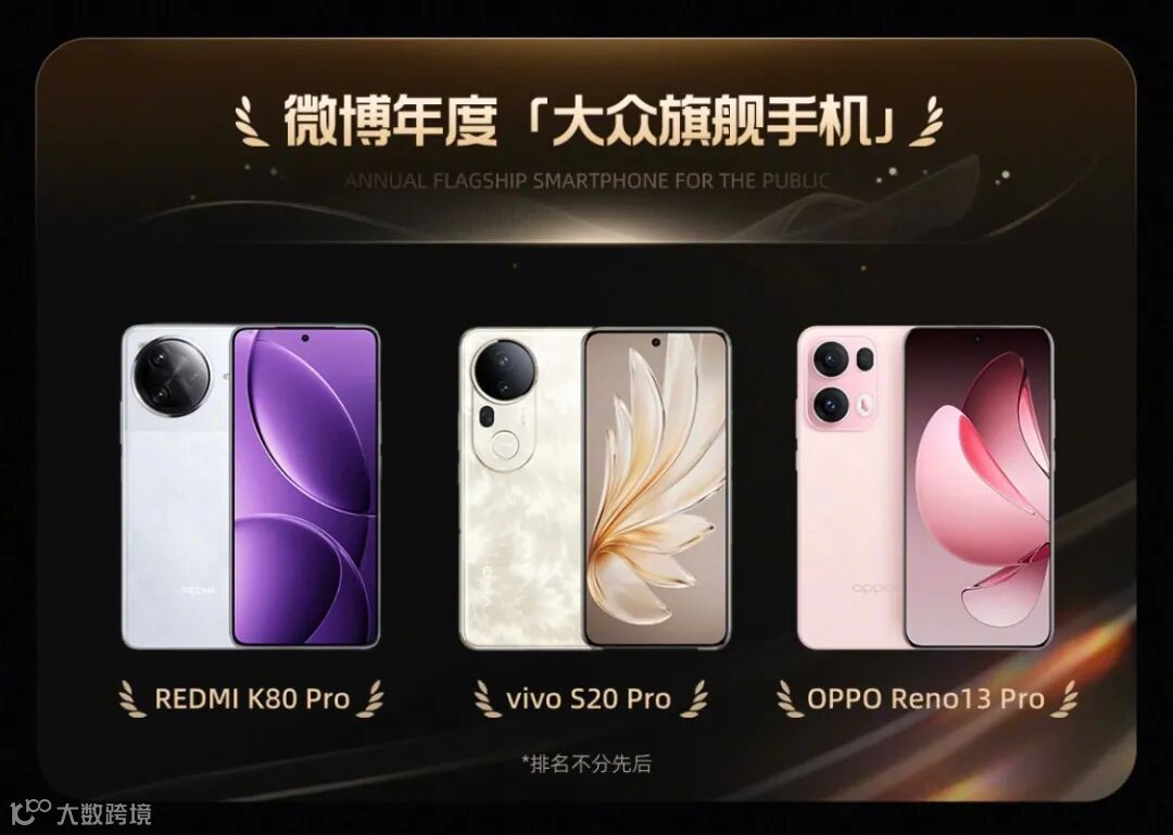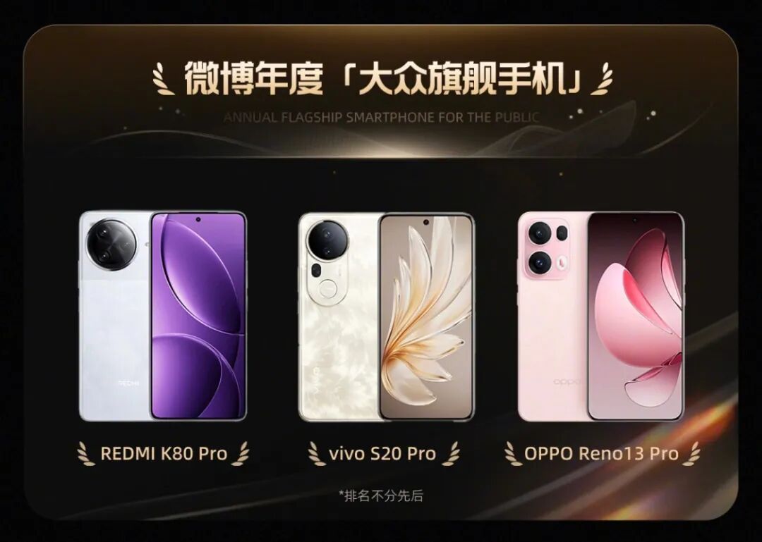 🏆微博年度「大众旗舰手机」:REDMI K80 Pro、vivo S20 Pro、OPPO Reno13 Pro(排名不分先后);🏆微博年度「人气高端旗舰」:vivo X200 Pro;🏆微博年度「性能手机」:小米15 Pro;