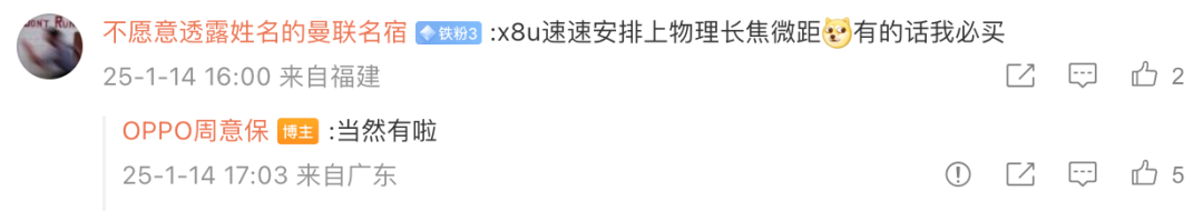 如上图所见,今日OPPO Find系列产品负责人周意保在微博和网友互动时透露等Find N5新款折叠屏发布后会开始预热Find X8 Ultra,并称Find X8 Ultra将会安排物理长焦微距,补足X8/Pro的遗憾。