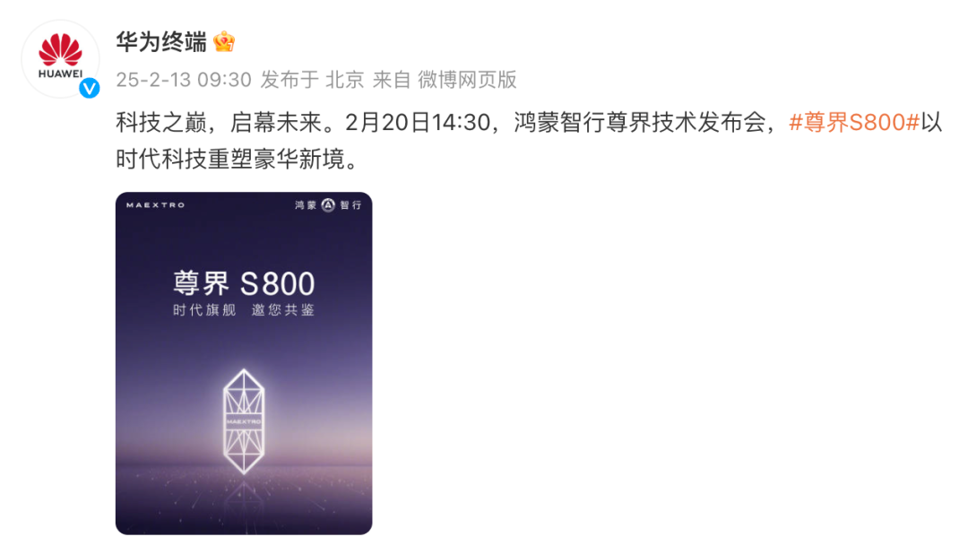 华为则将于2月20日14:30举行鸿蒙智行尊界技术发布会,介绍更多关于尊界S800的内容。