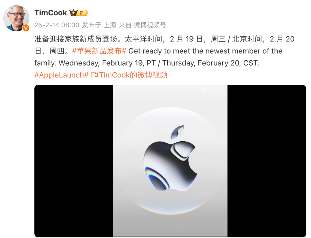 首先是苹果这边,北京时间预计是2月20日下周四的凌晨发布新品,预计会发布iPhone SE 4(也可能改名为iPhone 16E),网传还可能更新MacBook Air(M4)、iPad Air M3或新款iPad 11、苹果智能家居控制中枢、全新AirTag 2等。(*以上均为猜想,以实际发布为准)
