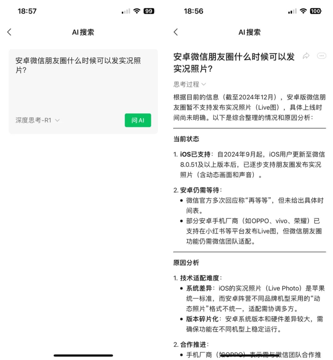 另外要说明的是,微信目前是在灰度测试中,据广州日报询问腾讯相关人士,微信搜一搜在调用混元大模型丰富AI搜索的同时,近日正式灰度测试接入DeepSeek,所以没灰度到的用户就暂时没有相关界面,推测过段时间应该会全面上线。问问大家,你平时会在微信使用搜索功能吗?