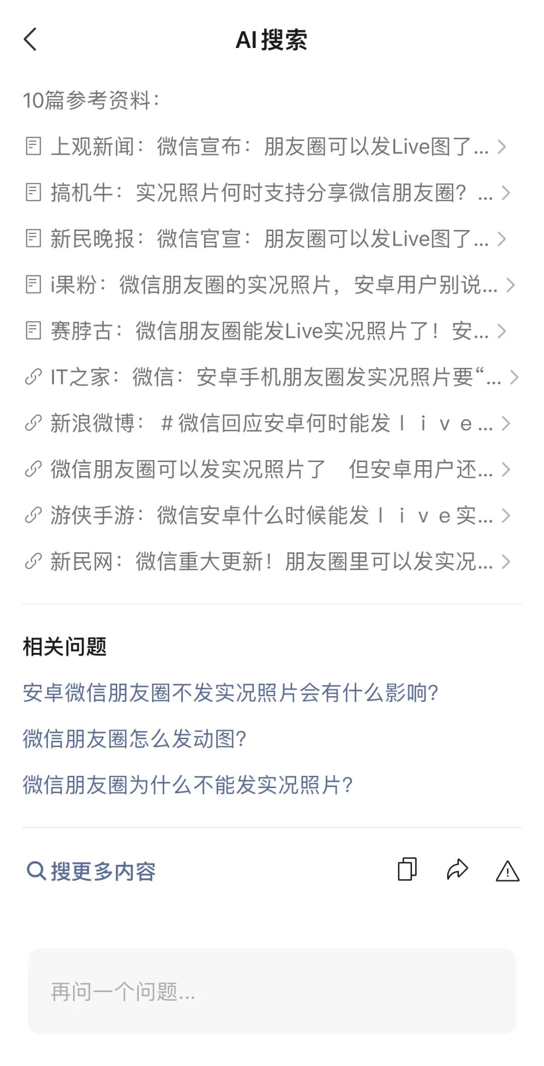 细节上值得注意的是,微信AI搜索这里接入的DeepSeek-R1引用的参考资料不只是网页消息,还有不少微信公众号的相关文章,页面最下方还支持继续提问。另外,微信这里搜索的问题页面还支持直接转发给朋友或朋友圈,不过目前没有历史问答界面,但本人实测如果问相同的问题进入后会直接出现上次的结果。