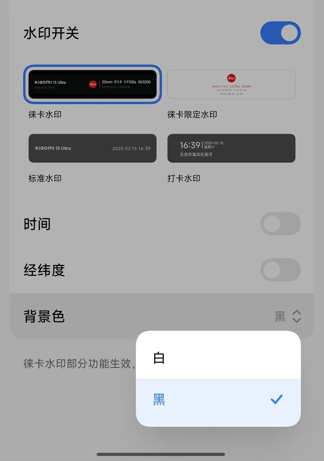如上图所见,小米15 Ultra相机开启水印时除了有小米经典的徕卡水印外,右侧新增一个「徕卡限定水印」选项、正是昨日公开的样张所使用的水印款式。细节上,小米15 Ultra徕卡水印现在还支持直出黑色背景色款式,没记错的话,之前如果要设置黑边水印,是要在相册-编辑中后期修改添加。不知道大家直出时更喜欢哪种水印款式?